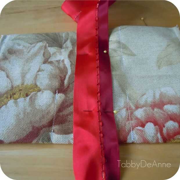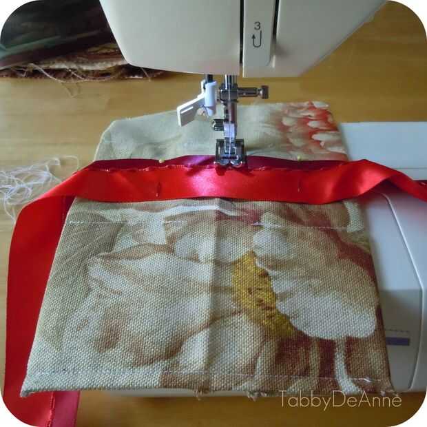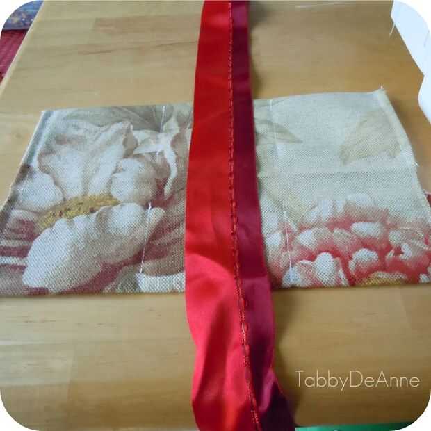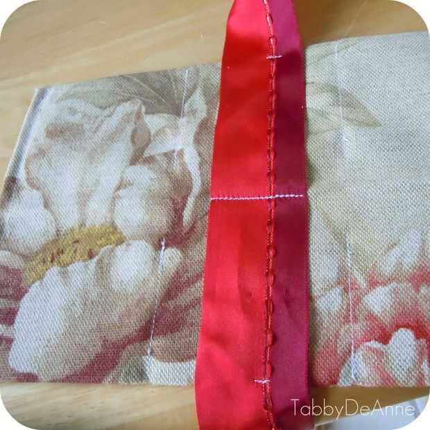 Coser a lo largo del pliegue medio de su tela de un lado de la cinta a la otra. Ahora coser unas puntadas en cada extremo de la cinta para sujetar a la tela.