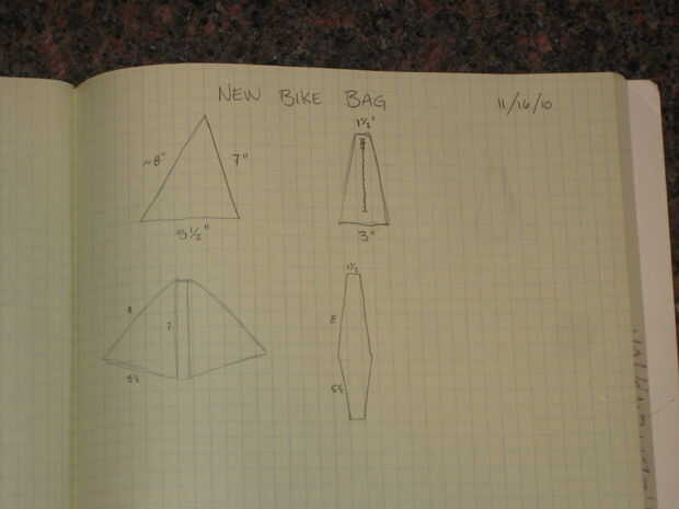 Tratar su bolso como si fuese un objeto rígido y evaluar cada forma geométrica. Mina pasó a ser en su mayoría triangular. Dibujarlos en una hoja de papel. En lugar de cortar cada forma geométrica y coser juntos, algunos de los extremos comunes juntos a tope y sólo doblar allí. Esto implica menos coser y por lo tanto un mejor parecido al diseño original. Rompieron mi bolsa en dos piezas separadas. Una pieza formada por dos triángulos laterales y la parte delantera (unida al tubo del asiento) mientras que la otra pieza fue la parte inferior y posterior (abertura) cara.