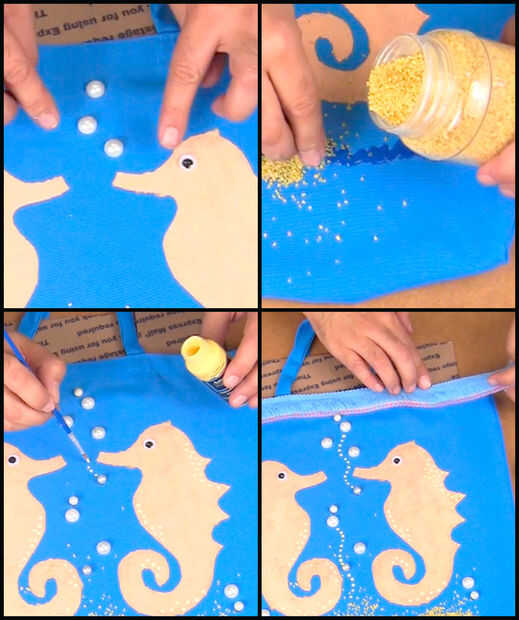 Pegamento en los ojos de googley, perlas y pecera rocas para crear el fondo de la bolsa