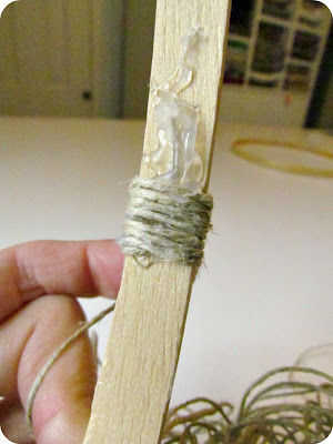 Ejecutar un poco de pegamento caliente por el centro de su aro y empezar a envolver su cordel de cáñamo