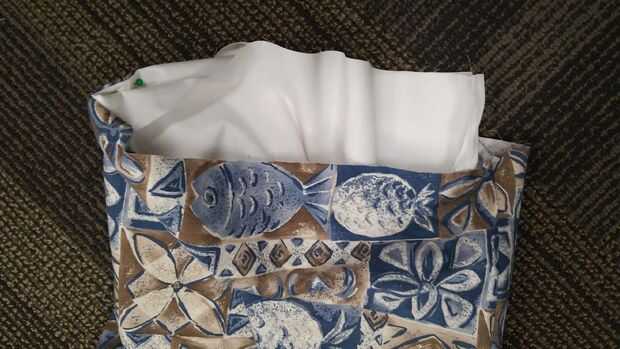 Dejar de lado equivocado hacia fuera la guarnición. Gire fuera de bolsa derecha hacia fuera. Abren las costuras laterales de prensa. Lugar de guarnición dentro de bolsa, coincidiendo las costuras laterales. Gire el borde superior del forro hacia abajo 1". Gire el borde superior de la bolsa hacia abajo 1". Perno tapa cantos. Los bordes crudos deben ser entre bolsa y forro.