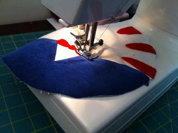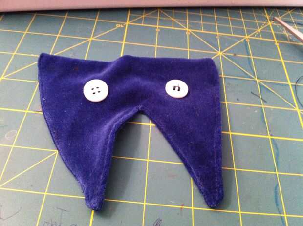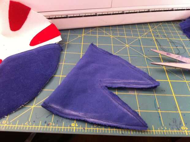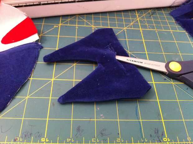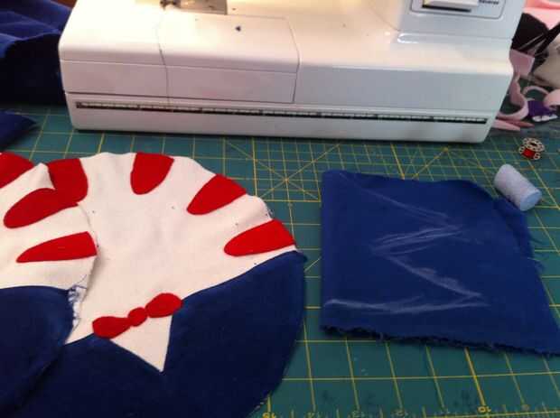 Trace el patrón tenidos en una pieza doble de tela azul si no lo has hecho ya, alineando el borde superior con el doblez de la tela. Con los derechos de la tela uno frente al otro, coser alrededor del exterior de la pieza secundaria. Corte una raja pequeña cerca de la tapa y gire a la derecha de faldones hacia fuera. Ahora coser una puntada recta en el exterior de los faldones, cerca del borde. Esto ayudará a alisar la pieza.