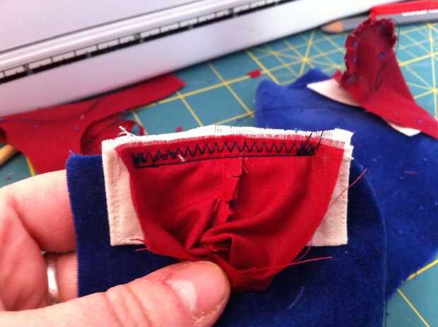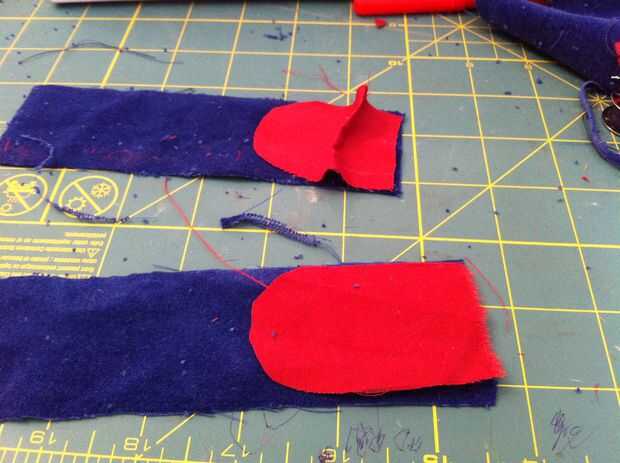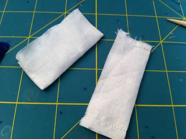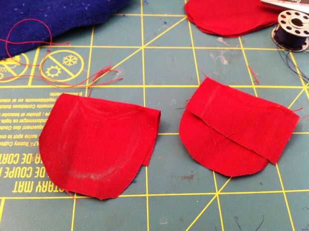 Marque dos piezas del patrón del zapato con una forma ovalada (como la línea de puntos en el patrón). Pellizque un pliegue en la tela y coser a lo largo de la línea, asegurándose de no coser todo el camino a la frontera de la tela (la frontera todavía debe coincidir con la pieza plana). sí, dije que era un dolor. Se trata de la parte delantera del pie. Ahora coser el borde recto de cada pie a un extremo corto de las piezas de la pierna (si tienen cuatro). Asegúrese de que los lados del derecho de la tela están uno frente al otro para que la costura termina en el interior cuando se está reunido.