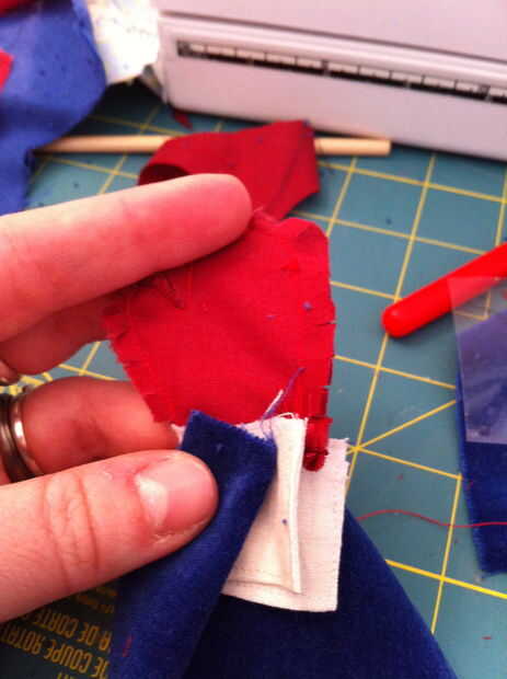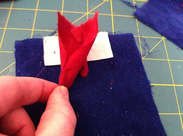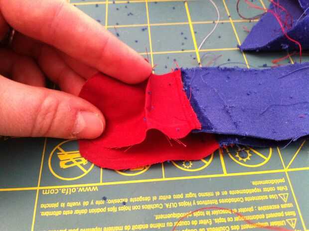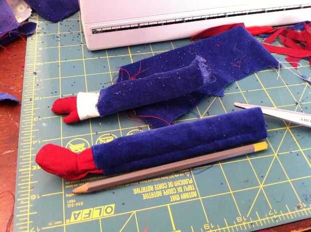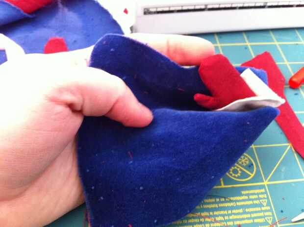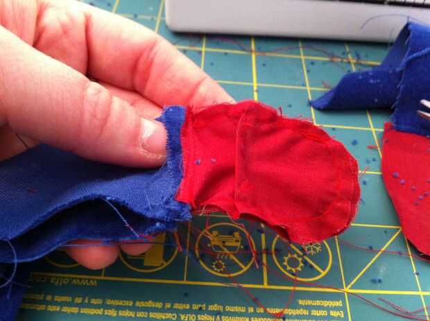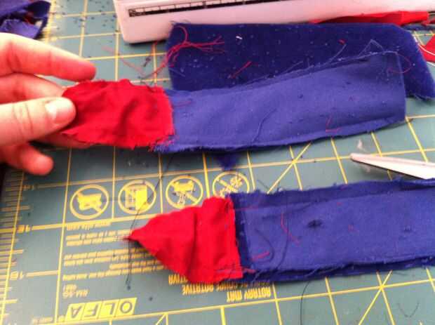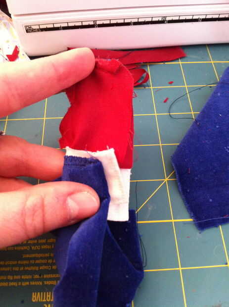 Coloque un trozo de tela azul brazo hacia fuera, lado derecho hacia arriba y alinee un trozo de manguito blanco encima de la tela azul con el borde de corte centrado y en el borde corto de la tela azul. Resultan una manopla derecha y abrir tanto como usted puede en la costura de pinky, alineando el borde de la muñeca con el borde abierto del manguito. Vas a odiarme por esto. Sólo tener en cuenta que realmente no saben coser y esto compone cuando fui a lo largo. Estoy seguro de que hay una mejor manera de hacer esto. Lo siento.