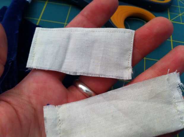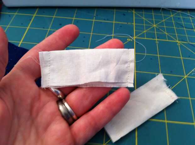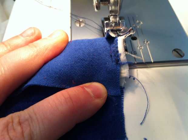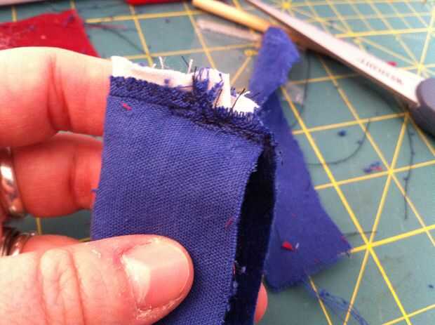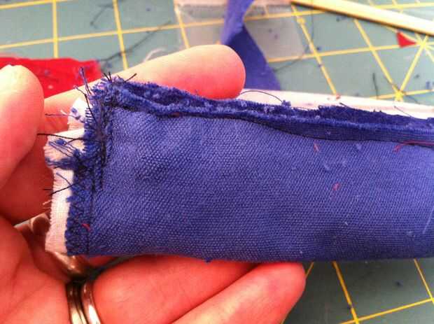 Coser el borde alineado de las tres telas tal como se muestra en la imagen. Ahora toda la pieza por la mitad longitudinalmente, con los derechos de la tela uno frente al otro y doble el lado pinky de la manopla cerrado, hasta la base de la banda blanca de la puntada. Hará un par de puntadas en el brazalete blanco. Los dos bordes cortos del brazalete blanco deben cumplir pero no.