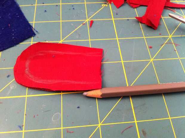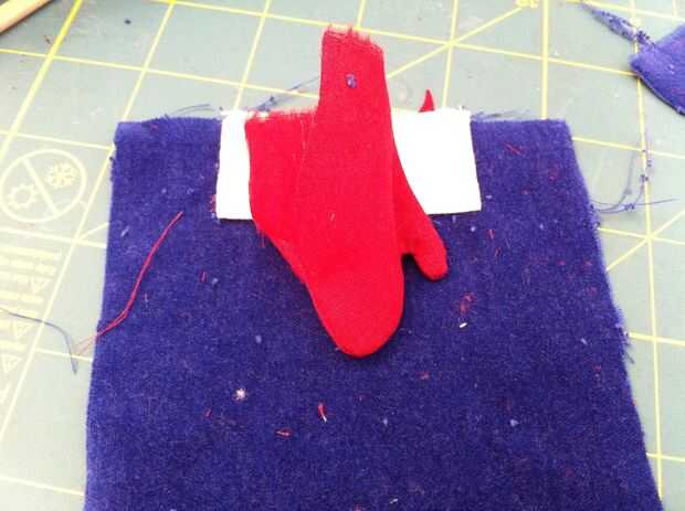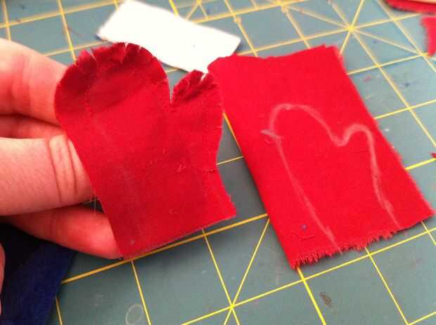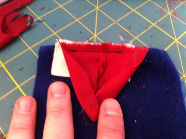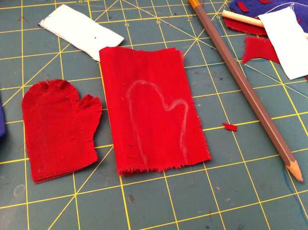Encontrar a la tela roja en la que usted trazó la parte de la manopla del patrón. Coser dos pedazos juntos, dejando el borde inferior (donde estaría la muñeca) y el pinky de la manopla plegada. Hacer pequeños recortes a lo largo de los bordes curvos para ayudar a mantener a la tela de arrugas cuando usted voltee hacia. Doble un pedazo blanco de brazalete tejido por la mitad y coser los dos extremos cortos. Gire derecha hacia fuera. Ahora coser a lo largo de la parte exterior de los puños blancos, incluyendo el borde doblado, para aplanarlo. No tienes que coser el lado abierto, ya que será la parte interior de una costura.