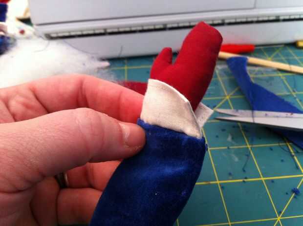 Girar la manopla derecha. Asegúrese de que usted como ve. Cosas la manopla con bateo de. En este punto, tuve que terminar de coser el borde azul para el manguito blanco... Yo no había cosido clara a los bordes del manguito blanco antes porque necesitaba espacio para girar la manopla de adentro hacia afuera. Creo que acabo de tener el guante dado vuelta derecha, relleno dentro de la tela azul (que todavía derecho enfrentaba en) y coser todo el borde recto. Hace para muñecas planas, pero mayordomo de menta es un poco flojo, de todos modos. Luego había cosido el lado largo abierto de la tela azul y resultó el brazo derecha. Si tiene suerte, usted no habrá cosido parte de la manopla en la costura de brazo material. :)