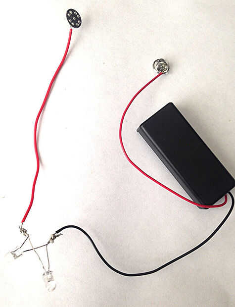 Suelda el otro cable que cortes como parte del paso 2 el otro cierre metálico y el otro extremo a las piernas más largas de 2 LED, como se muestra en la imagen.
