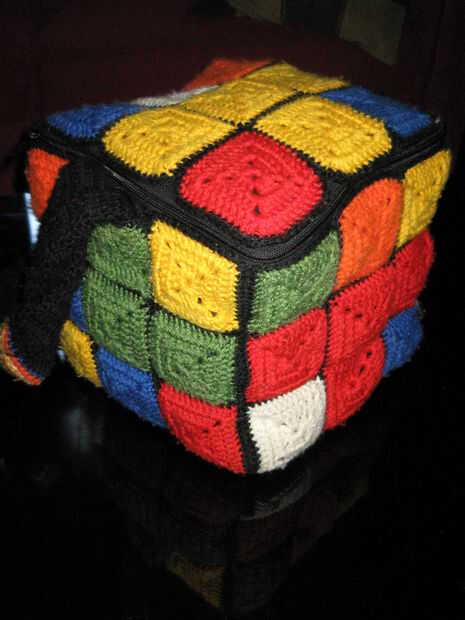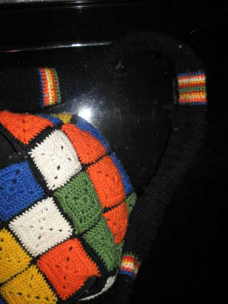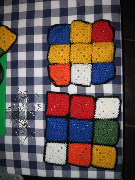 Se hace de 54, 3 redondos cuadrados granny de dc (9 de cada color) con una sola ronda de sc en negro de bordes.