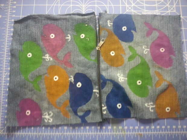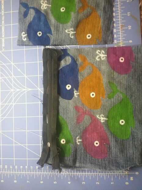 Lugar del borde superior de la tela a un lado de la cremallera y cosa. Hacerlos mismo en el otro lado. Repita esto para el revestimiento y comience a coser una puntada superior cerca de la cremallera. Entonces pin y coser dejando un pequeño agujero a vuelta adentro hacia fuera como se ve en la foto. Gire a la derecha lado, mano coser cerca del agujero y disfrutar de tu nuevo bolso del lápiz de ballena. :)