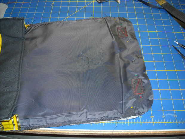 Conecte las lengüetas de velcro en el interior de la tapa frontal, compatibilizarlos con las lengüetas de velcro en el cuerpo principal de la bolsa. Hilvanar las capas de la tapa frontal. Hacer esto antes de colocar el enlace de la costura.