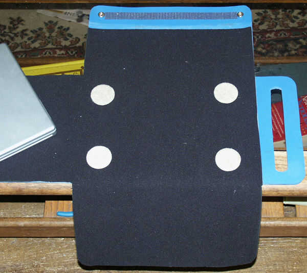 corté el neopreno para que cuando la bolsa se pliega junto forma el interior de la bolsa. Uno de los pasos finales es adherirse a la estera de goma con cemento de contacto. Añadido algunos espaciadores de tela para permitir un poco de aire en el powerbook, que puede conseguir bloomin caliente les digo ya!