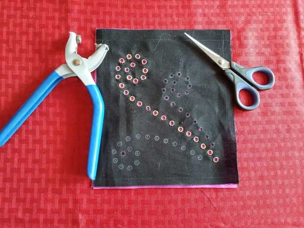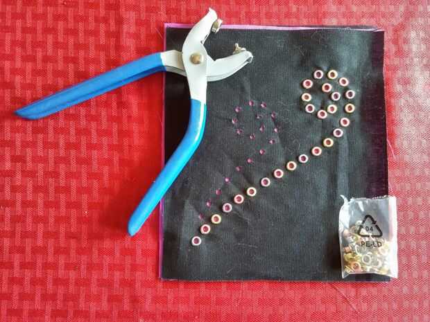 A continuación, asignamos los ojales. Si nos fijamos en las fotos, usted verá que no corté todos los agujeros antes de agregar los ojales. No hay razón para esto, me tiene aburrido corte agujeros y quería hacer algo más, por lo que había prensado ojales. Sólo siga las instrucciones de la herramienta de ojete les doblarla hacia abajo en los agujeros, y eres bueno para ir. Ya que estamos utilizando ojales, asegúrese de que los lados redondeados todos están orientados hacia la misma dirección. La parte posterior del ojeteador del prensado se ve mal, por lo que deseamos los ocultar a.