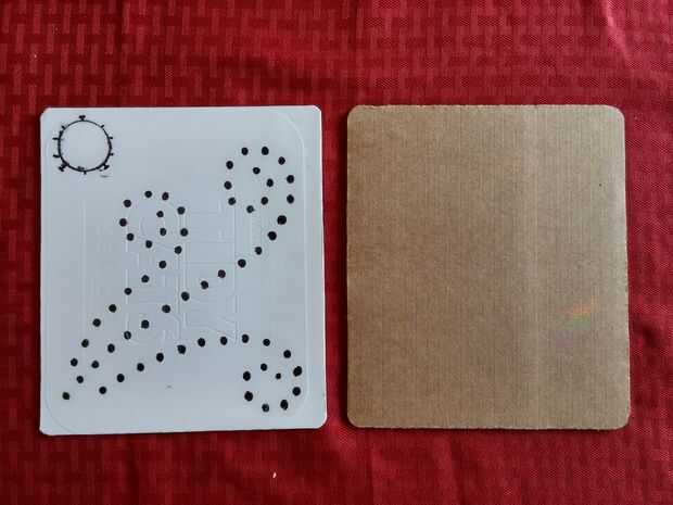 También corté un pedazo de cartón del mismo tamaño que el forro del plástico. Usé esto para simular el grueso agregado de los LEDs, que más adelante añadiremos al plástico. Puede el cartón a la parte posterior del plástico de la cinta ahora si quieres, sólo asegúrese de que está mostrando la parte delantera de la plantilla.