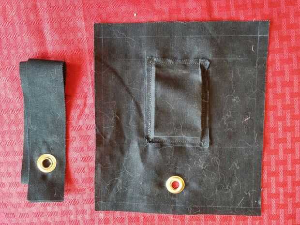 Ahora vamos a añadir algunos anillos, así que hay unos agujeros acabados para los cables del interruptor. Estos no será visibles cuando se termina la bolsa, por lo que el color no importa. Un ojal se colocará en una sola pieza de la lona lateral o inferior, cerca de un extremo. Deje un mínimo de 1" del final para doblar la costura. El otro ojal irá en el lienzo con el bolsillo de la batería, sobre el bolsillo. El ojal en la pieza del bolsillo se alineará con un agujero en el plástico, por lo que es sabio para que no interfiera con la colocación del LED. Se puede ver en mi foto, accidentalmente puse una arandela debajo de la bolsa, en vez de por encima. Esto fue una solución fácil, ya que el error no será visible. Acabo de poner otro ojal en el lugar correcto. Aprender de mi error y comprobar lo que está haciendo. Ya había conectado el bolsillo por este punto, pero voy a explicar en el siguiente paso.