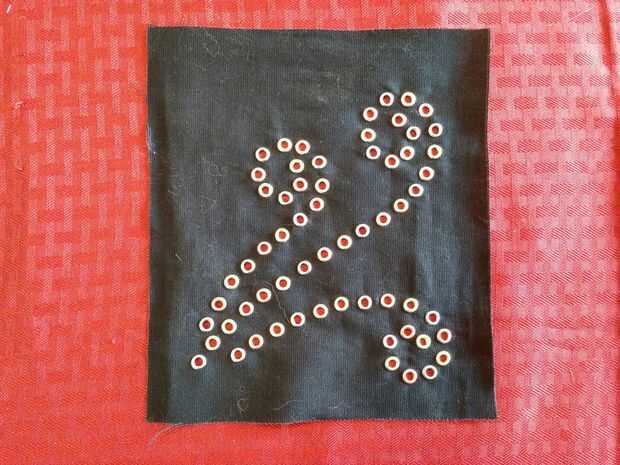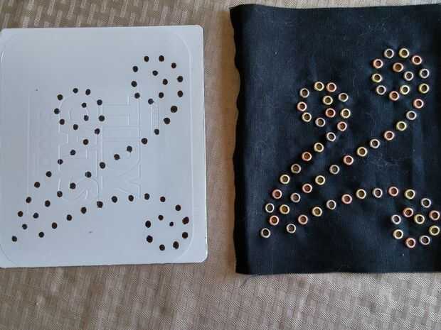 A continuación necesitamos marcar donde el LED brillará a través de la tela, para colocar algunos ojales. Usé mi plantilla de papel, orificios penetra con mi lápiz blanco de la tela a través del centro de cada ubicación de LED a través de la tela y torcí para marcar un montón de puntos. Luego usé una plantilla de círculo del tamaño adecuado para marcar dónde iría mi ojales, así que pude corte agujeros para ellos. Los agujeros deben ser ligeramente más pequeño que los ojales para que agarre a la tela bien cuando los aplaste. Podría utilizar un sacador de tela para hacer los agujeros, pero no pude encontrar mía, usé un par de tijeras para cortar hacia fuera.