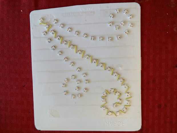 ¿Te acuerdas de hacer la imagen inversa de la plantilla de diseño de LED en la parte posterior de la pieza de plástico? Ahora es el momento viene bien. Cubrir la plantilla de reversa en la cinta de doble cara y pegar el lado de la almohadilla de LEDs en los lugares de LED, teniendo cuidado de que se volvió la misma dirección. Esto asegura correcta longitud y espaciamiento para soldarlos juntos y mantener los LEDs en su lugar.