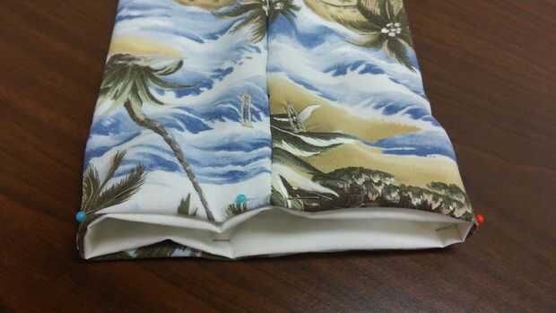 Colocar el forro dentro del bolso, coincidiendo las costuras. Gire los extremos superiores hacia abajo 1/2". PIN.