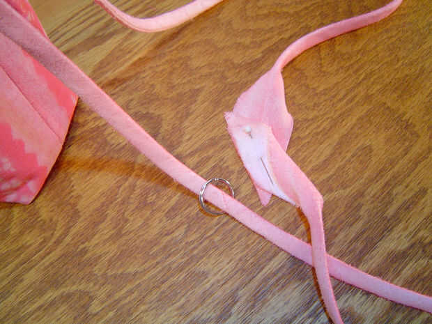 Determinar la longitud del cable que desee.  Me decidí por unos 60" para este bolso.  Me corte 2" tiras de bies ancho de la tela blanca y coser juntos para crear la longitud de cable que quiero.  Pulse las costuras abiertas y doblar longitudinalmente con derecho lados juntos.  Coser la costura, dejando un par ha cosido en cada extremo.  Girar derecha cable usando un alfiler clavado en un extremo descosido y tirando a través del cordón.  Luego colocó en mi caja de pintura de spray y rocía al azar con los tres colores que usé en la bolsa.  Tendrá que girar algunas veces a todas las superficies pintadas.  Enhebrar el cordón por los ojales.  Pongo anillos de split en el cable como que pasan por los ojales porque me gustan los lugares para colgar cosas en mis maletas.  Un anillo está en el exterior de la bolsa y uno está en el interior.  Me había emparejado los cabos inacabado de las cuerdas y les suturan.  Entonces la mano cosió el cable cerrado.