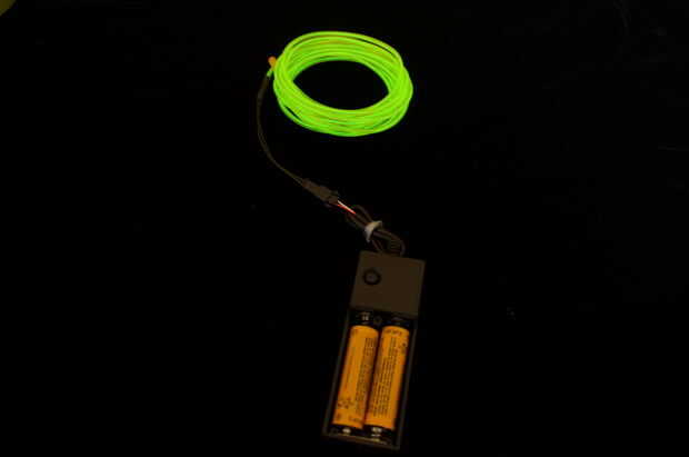 Prueba el EL cable para asegurarse de que funciona. Deslice las pilas AA 2 x y presione el botón de encendido.
