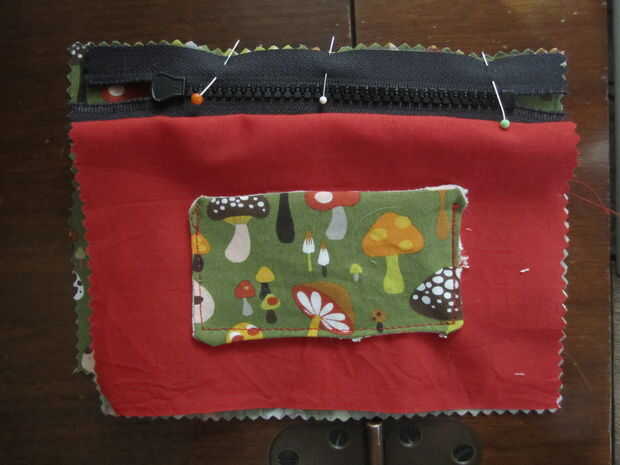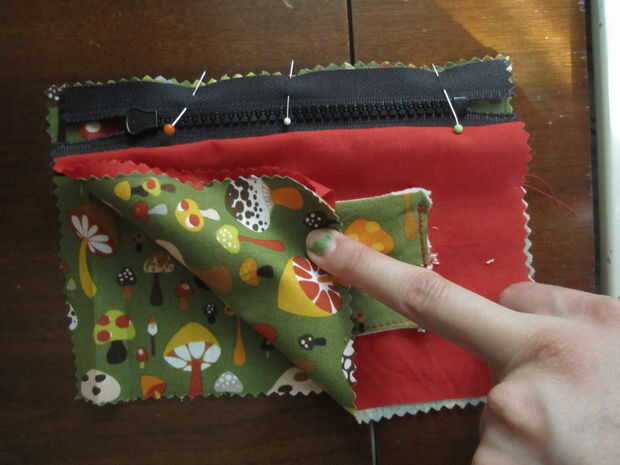 1. con el lado derecho de la tela exterior hacia arriba y la cremallera hacia abajo, alinee el borde de la cremallera con el borde superior de la tela. Pin el borde de la cremallera en el borde superior (lado más largo) de la tela exterior (Foto 1, 2). Yo no puedo cambiar la posición de mi aguja, pero si se puede, colocarlo como lejos izquierdo (y más cercana a los dientes de la cremallera) como puede, pero no toque los dientes de la cremallera. Coser el borde de los dientes.