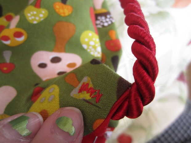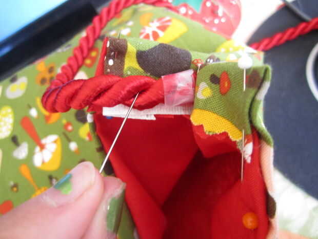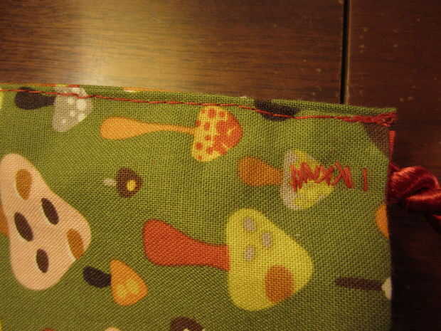 1. en el lado izquierdo de la bolsa, puso un extremo de la cuerda entre los dos lados de la bolsa. Elegí a mano puntada en primer lugar, para darle un mejor agarre. Acabo de ir hacia adelante y hacia atrás una y otra vez y arriba y abajo el cable hasta que pensé que llevaría a cabo bastante bien (después pensé que estaba 'hecho' coser a mano, le di un pequeño tirón para ver si era resistente) (Foto 1,2)