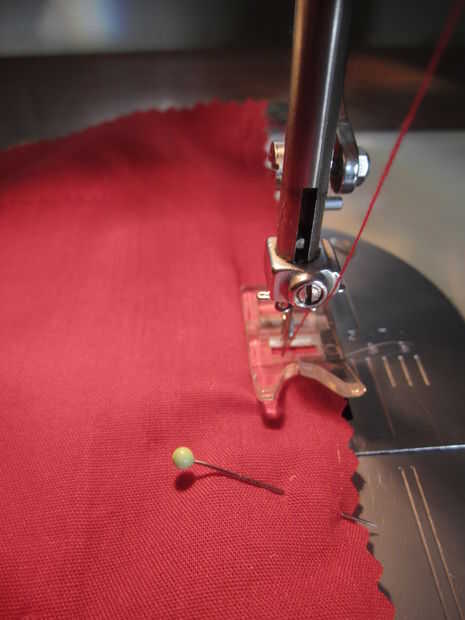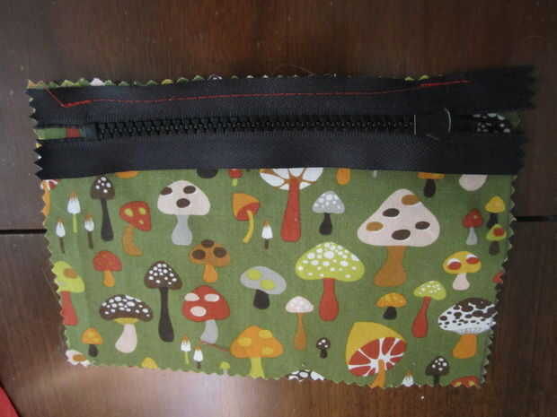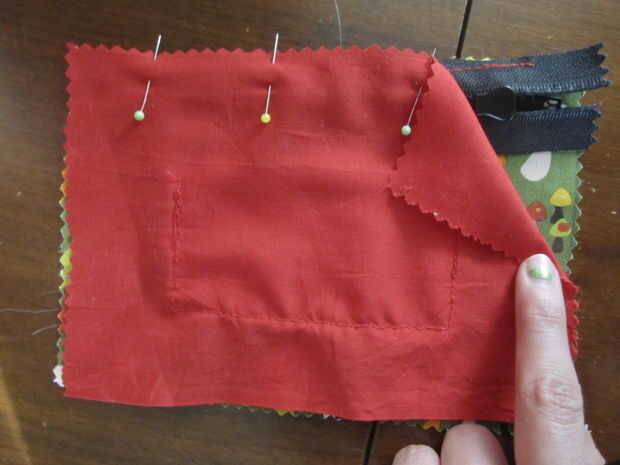 1. con la tela exterior hacia arriba y la cremallera hacia abajo, alinee el borde de la cremallera con el borde superior de la tela. Pin el borde de la cremallera en el borde superior (lado más largo) de la tela exterior (Foto 1). Yo no puedo cambiar la posición de mi aguja, pero si se puede, colocarlo como lejos izquierdo (y más cercana a los dientes de la cremallera) como puede, pero no toque los dientes de la cremallera. Coser el borde de los dientes (Foto 2).