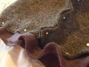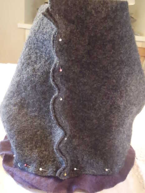 Este paso no irá bien a menos que prender la sección del cuerpo (suéter A, gris aquí) una pulgada en el borde alrededor de todo el camino. Recuerde que usted corte el fondo (suéter B, púrpura aquí) dos pulgadas demasiado grande para permitir un error (como si) y subsidio de costura.