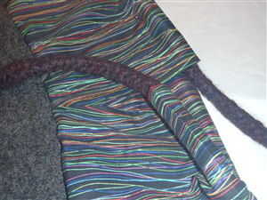 Cóloque el cordón dentro de su tubo de algodón a lo largo del borde doblado superior. Permitiendo un poco de espacio extra para coser fácilmente (una pulgada o tan), para incluir el cable – esto es su tubo de lazo. Creo que es más fácil dejar el cable en y coser alrededor de él, en lugar de coser y luego tratar de conseguir el cable, pero su llamada.