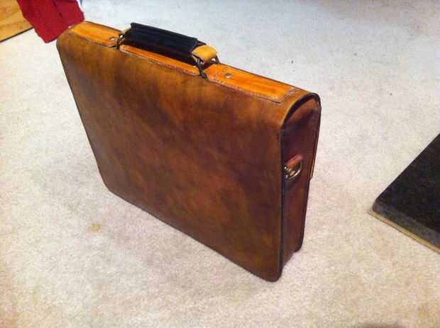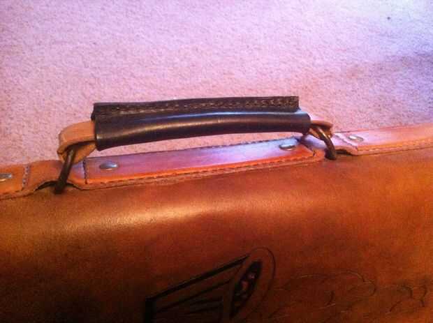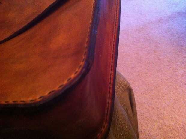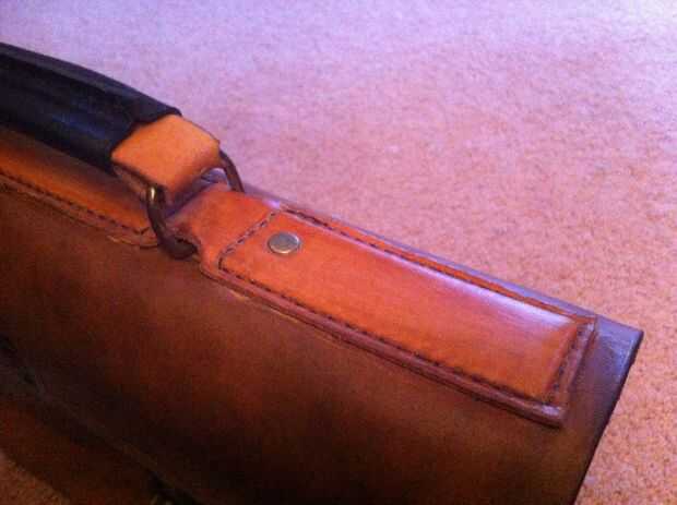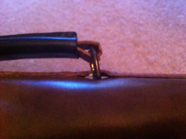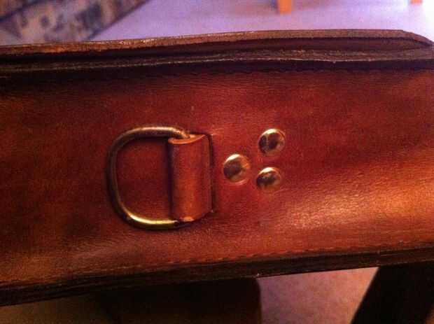 Bajo la tira de cuero que sujeta el mango, le puse una tira de plástico flexible que lo endurece y reduce la flexión lateral. También los anillos en D para el asa están jalando el plástico y no el cuero para no estirar fuera de forma.