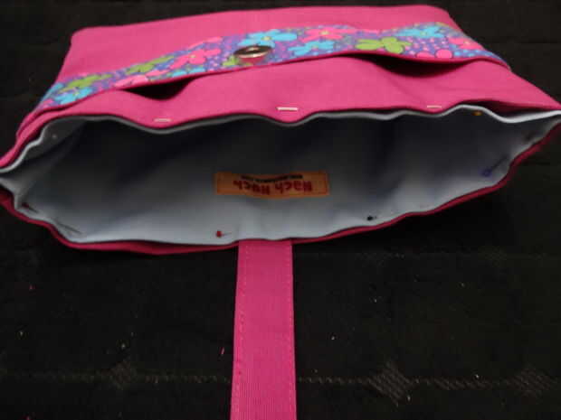 Poner las telas azul mutuamente, pin con agujas y coser tres. Se trata de la capa interna de la bolsa. Ahora poner la tira con broche de imán y la capa interna dentro de la bolsa. Fotos decirte más. Coser la boca de la bolsa para unir cada parte (cuerpo principal, capa interna y la tira).