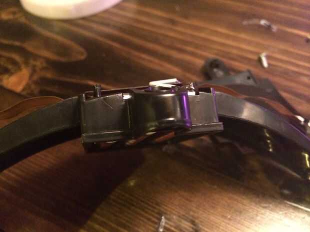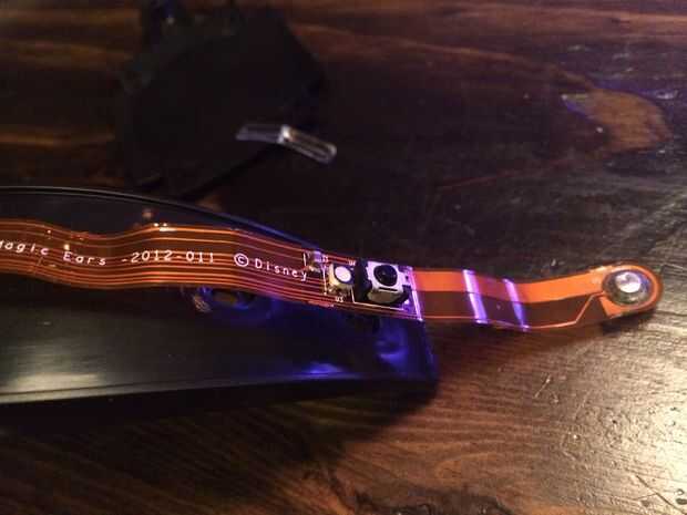 El proceso comienza por ripear el inserto de espuma interna que se pega en su lugar dentro del sombrero que protege los componentes electrónicos que están conectados a una banda plástica arqueada. Con cuidado abrir los oídos dos piezas de plástico exponiendo el PWB flexible que recorre el sombrero y tiene las luces y otros aparatos electrónicos conectados. Necesitará un destornillador pequeño para completar la eliminación de las orejas, y es bastante probable que esto destruirá los oídos en el proceso, pero usted está haciendo algo por lo menos tan cool en su lugar! Tome nota de que los cables de conexión en el compartimiento de la batería son de modo que puede asegurar correcta reubicación. Utilizando un soldador, calor y retire las conexiones de cables del compartimento de la batería. Usando una sierra o amoladora de la herramienta, retire el titular de tornillo compartimiento de batería y la banda de plástico a cada lado del compartimento de pilas. Esto le dejará con un simple rectangular 3 AAA baterías pilas. Repita en ambos oídos.