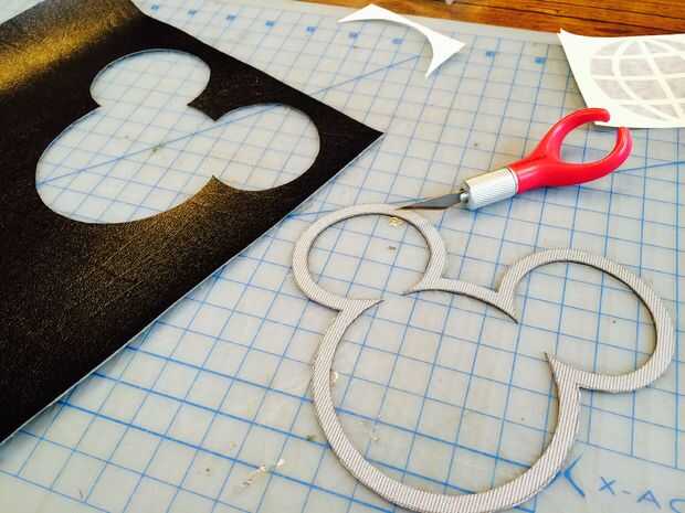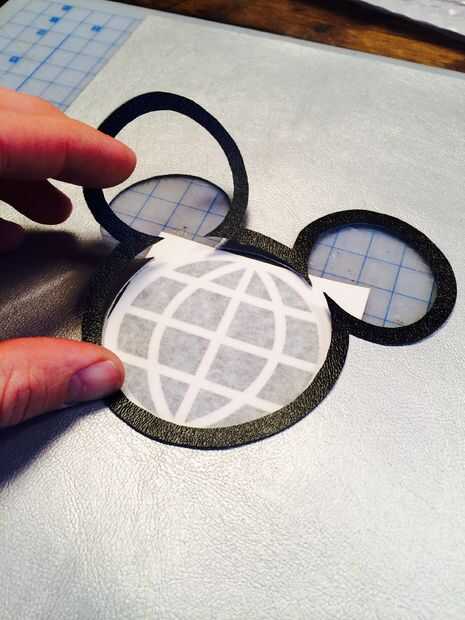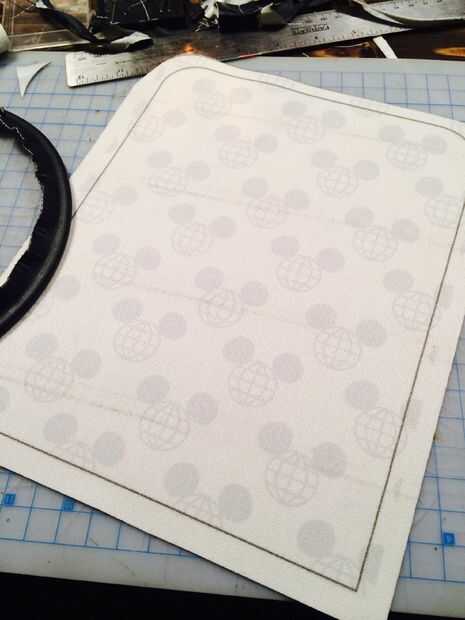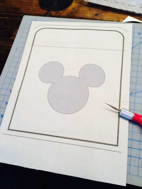 Cuidadosamente usando un cuchillo afilado exacto, recortar la silueta del logo de mickey de la plata y el vinilo negro. También cortar el patrón que es necesario reducir el dobladillo a 1/2" si es necesario o lo que usted está cómodo trabajando con. Usted también querrá cortar la tira para el lado de la bolsa. El bolso es 2.5" de ancho, así que corte una tira larga en 3.5" de ancho para permitir una 1/2" trabajo dobladillo en cada lado. También cuidadosamente a cortar la pieza frontal en dos a lo largo de la línea de la cremallera del bolsillo delantero.