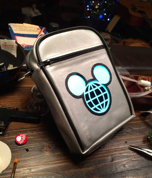 Enmascaramiento de la forma del logo, una vez más utilicé varias capas de adhesivo en aerosol aplicado directamente sobre EL panel. Luego cuidadosamente se deslizó lo en el bolsillo delantero y utilizando el método de adhesión anteriores, aseguró en el interior de la anterior corte. Luego retirar la protección adhesiva en el logo y pegado sobre la etiqueta globo cortada con un plotter de vinilo. Yo entonces había alineado la parte posterior del panel EL con otra sección equipada de vinilo tapicería negra. Esto fue pegado en su lugar con adhesivo en aerosol cuidadosamente aplicada.