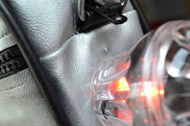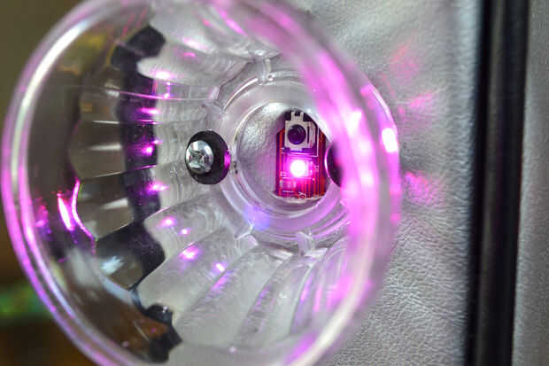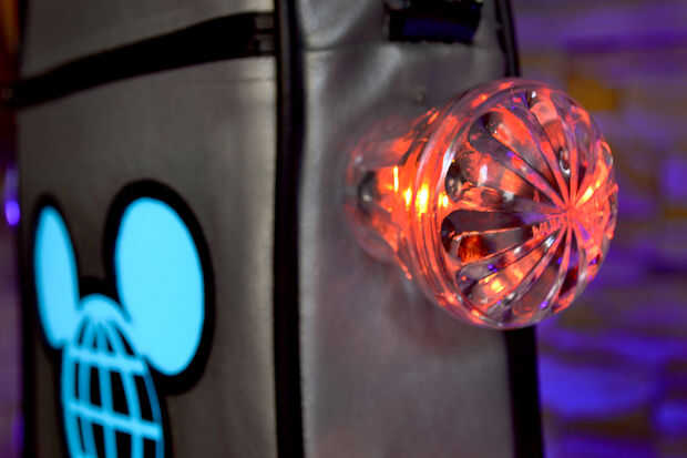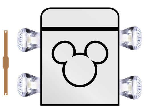 Utilizando un material de hoja plástico fino, firme (he utilizado una hoja de pvc llamada Sintra), he creado un marco único corriendo por los lados interiores y la parte inferior. Esto me dio algo para sujetar más firmemente las cápsulas de diversión-luz. Determina la colocación de las luces en la bolsa y corte dos ranuras sólo lo suficientemente grande como para deslizar el PWB flexible, exponiendo sólo el LED, o el sensor LED e IR en la parte exterior de la bolsa. Las luminarias de diversión fueron colocados alrededor de los LEDs y las ubicaciones de los dos orificios están marcadas, entonces perforado. Usando pernos con arandelas de goma, las luces de la diversión están aseguradas en su lugar. La versión de las orejas de Mickey, estoy usando tienen un toque metal sensible de correos, que penetra a través de un agujero y caliente pegado en lugar. Esto se convirtió en un casi invisible interruptor justo por encima de las luces principales.