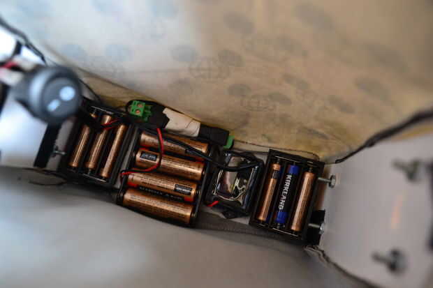 También se agregan a la bolsa es otra pieza de la misma hoja de plástico doblado en un extremo con un pice de velcro. Esto cabe perfectamente en la parte inferior de la bolsa encima de las baterías y el inversor. Si me pasé un poco más de tiempo, estoy seguro de podía haber reducido las baterías hasta cierto punto, pero no fue pesado o incómodo, y todo funcionará para por lo menos una noche si no varios.