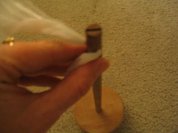 Una vez fijado, agarrar el eje por el punto de fijación y giro entre los dedos. El peso en la parte inferior mantiene el giro del huso. Mantenga la tira de plástico en la otra mano y pagar la tira como retuerce en hilos.
