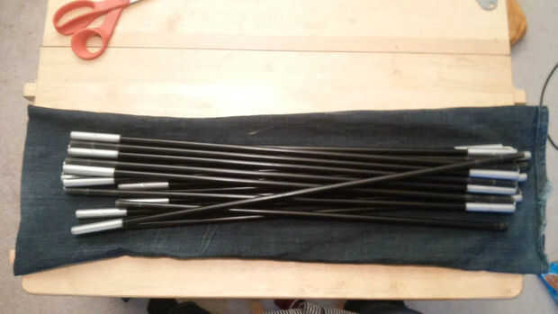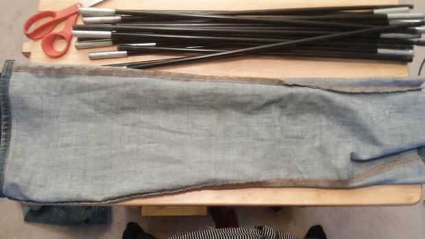 Empecé por una de las piernas de jean a poner sobre la mesa y colocar las estacas en la parte superior para medir cuánto tiempo la bolsa tuvo que ser.
