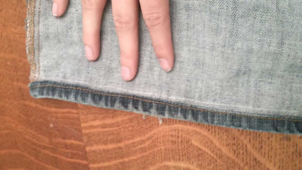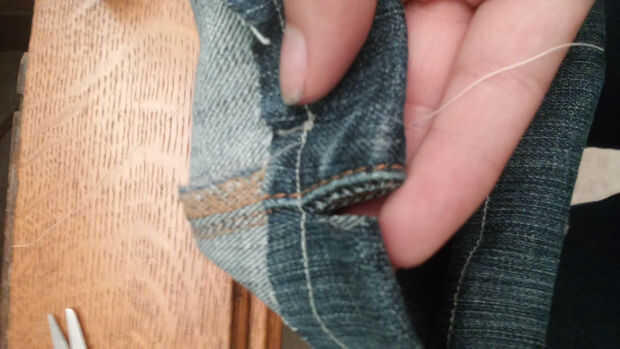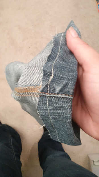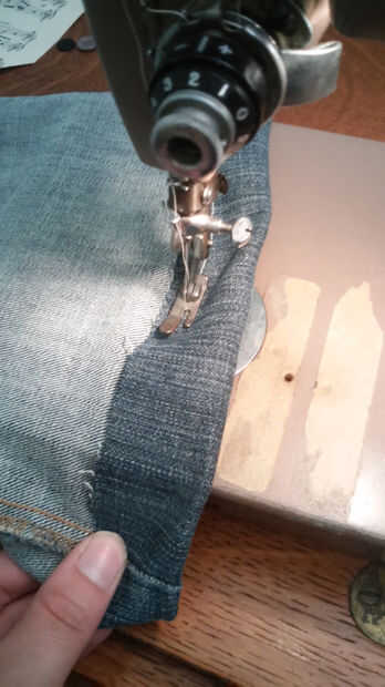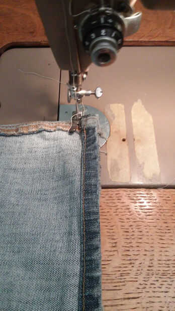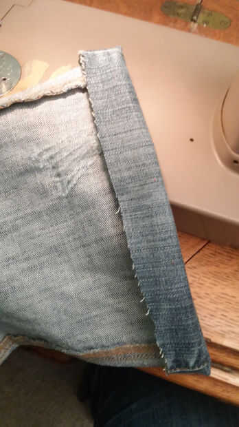 Comencé doblando encima y coser el extremo cortado de los jeans para crear un bucle cosido alrededor del borde de la tela.