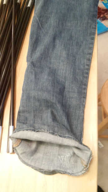 Finalmente me cosieron la parte inferior de los pantalones vaqueros y había volteado el jean de la pierna derecha hacia fuera otra vez.