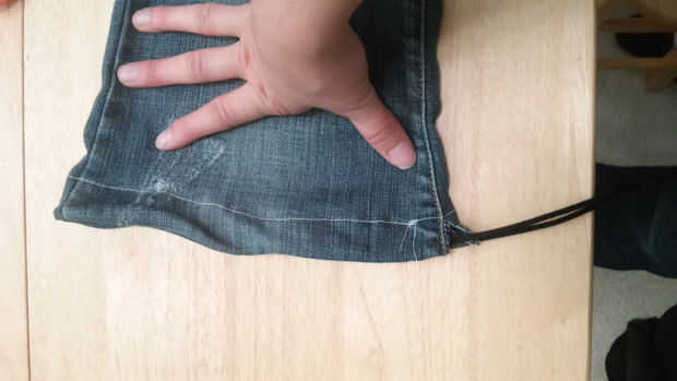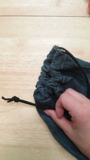 Mi siguiente paso fue añadir el lazo. Me propuso volver a los cordones de la bolsa vieja y dibujó lentamente a través del lazo que había cosido antes.
