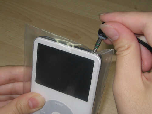 Inserte la clavija de auriculares en el conector de perforación de un agujero en la bolsa.