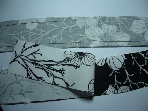 Coser juntos las correas a lo largo de los bordes laterales, una blanca y una negra encarando los derechos. Hacer lo mismo con la otra. Interior al reves y presiona las costuras. Si desea puede Agregar ahora una estrecha costura decorativa a lo largo de los bordes laterales. No en la mía. Cortar a la longitud exacta de la misma si no están ya y dejar de lado.