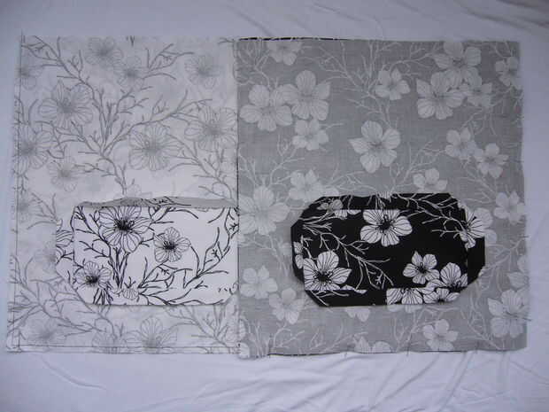 Tomar tanto tus piezas y coserlas juntas a lo largo de los lados y la parte inferior (derecho contra derecho). Deje la tapa abierta. Hacer lo mismo con los negros. Cortar un poco de las esquinas en la parte inferior. Esto hace que las esquinas más puntiagudos cuando se gira la bolsa.