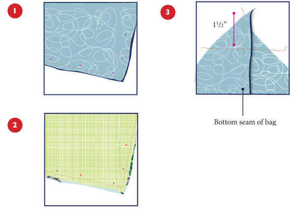3. apriete cada esquina inferior juntos y coser a través de 1 1/2" de la esquina.