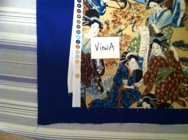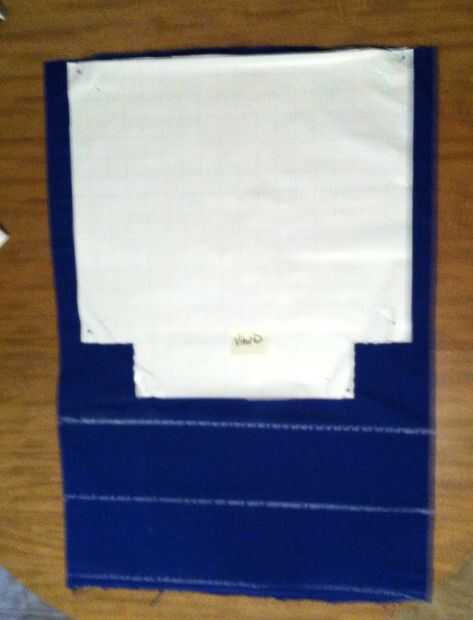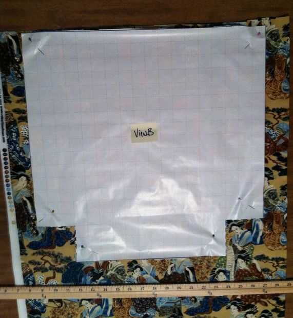 Prender su pieza a la parte superior del borde crudo en un trozo de tela (vista B). Cortar la pieza de patrón.
