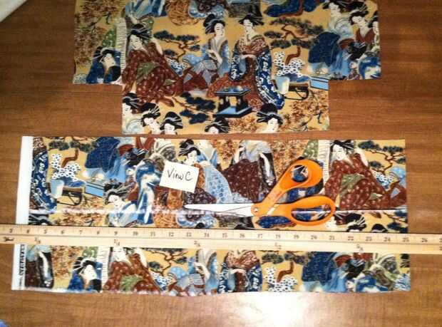 Tomar los trozos restantes de la tela y poner hacia fuera plana otra vez. Marcan dos pedazos de cinta iguales horizontalmente con su tiza y criterio, esta vez a partir de abajo hacia arriba (vista C). Corte a la tela a lo largo de las líneas de tiza.