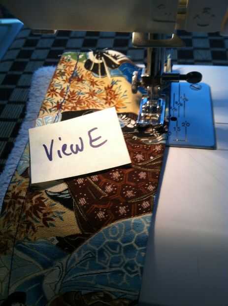 Presione cada tubo plano (vista D). Pespuntear el 3/8" de los bordes largos, a ambos lados de cada tira (ver E).