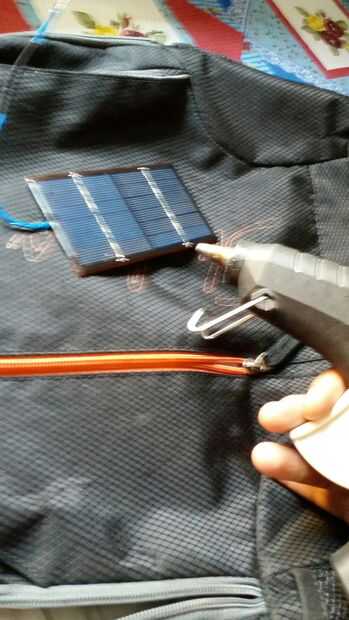 Usando pistola de pegamento Fije el panel solar a la bolsa