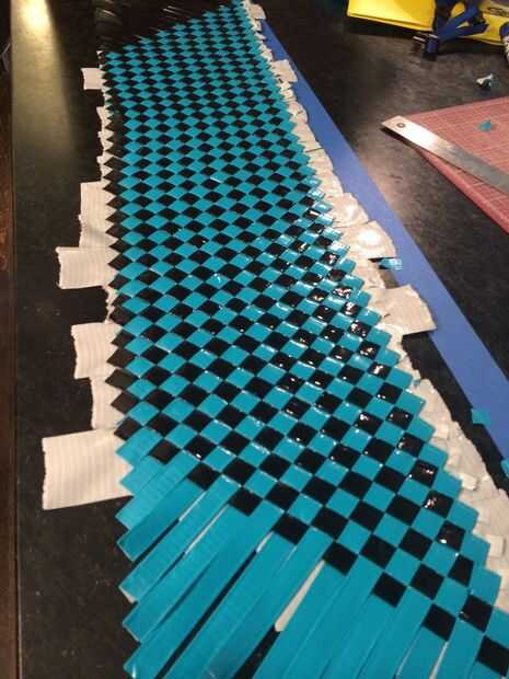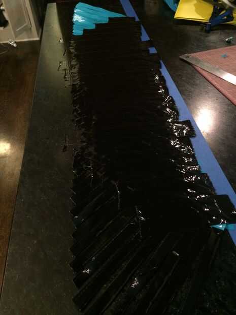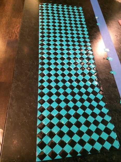 Después de teje las tiras, cubrí la parte posterior en cinta negra. Luego cortado la cinta extra. Mi hoja de la cinta era 23 pulgadas de largo y 7,25 pulgadas de ancho.
